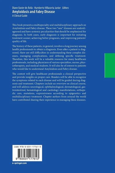 This book presents a multispecialty and multidisciplinary approach on Amyloidosis and Fabry disease. These two "rare" diseases are underdiagnosed and have systemic peculiarities that should be emphasized for diagnosis. In both cases, early diagnosis is important for initiating treatment sooner, achieving better prognosis, and improving patients' quality of life.