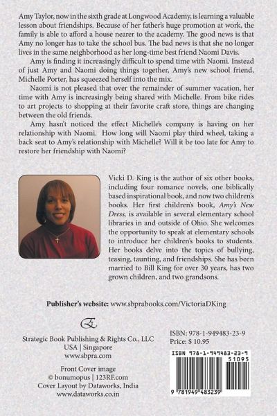 Amy Taylor, now in the sixth grade at Longwood Academy, is learning a valuable lesson about friendships. Because of her father's huge promotion at work, the family is able to afford a house nearer to the academy. The good news is that Amy no longer has to take the school bus. The bad news is that she no longer lives in the same neighborhood as her long-time best friend Naomi Davis. Amy is finding it increasingly difficult to spend time with Naomi. Instead of just Amy and Naomi doing things together, Amy's new school friend, Michelle Porter, has squeezed herself into the mix. Naomi is not pleased that over the remainder of summer vacation, her time with Amy is increasingly being shared with Michelle. From bike rides to art projects to shopping at their favorite craft store, things are changing between the old friends. Amy hasn't noticed the effect Michelle's company is having on her relationship with Naomi. How long will Naomi play third wheel, taking a back seat to Amy's relationship with Michelle? Will it be too late for Amy to restore her friendship with Naomi? Vicki D. King is the author of six other books, including four romance novels, one biblically based inspirational book, and now two children's books. Her first children's book, Amy's New Dress, is available in several elementary school libraries in and outside of Ohio. She welcomes the opportunity to speak at elementary schools to introduce her children's books to students. Her books delve into the topics of bullying, teasing, taunting, and friendships. She has been married to Bill King for over 30 years, has two grown children, and two grandsons.