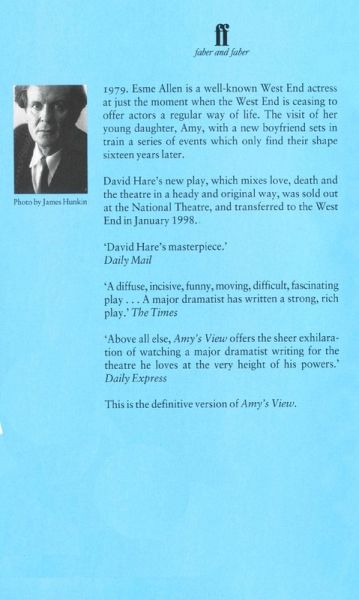 1979. Esme Allen is a well-known West End actress at just the moment when the West End is ceasing to offer actors a regular way of life. The visit of her young daughter, Amy, with a new boyfriend sets in train a series of events which only find their shape sixteen years later. David Hare's new play, which mixes love, death, and the theatre in a heady and original way, was sold out at the National Theatre, and transferred to the West End in January 1998. This is the definitive version of Amy's View.