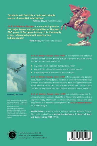 A-Z of Modern Europe since 1789 is a comprehensive historical dictionary which defines modern Europe through its important events and people. It includes entries on: -- key people from Napoleon Bonaparte to Hitler -- key political, military, diplomatic and economic events -- influential political movements and ideologies A-Z of Modern Europe since 1789 offers accessible and concise accounts of over 400 subjects. The book is cross-referenced and thus provides associated links and connections, while the appendix contains essential extra information on European monarchies. The book also contains six helpful maps of the continent's geopolitical organisation. A-Z of Modern Europe since 1789 is a valuable companion for school and undergraduate students of history and politics, and is a source of ready information for anyone interested in Europe's past and present. It is intended to complement an A-Z of Modern Britain by John Plowright.