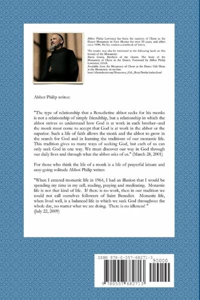 These are selections from the Notebook of Abbot Philip Lawence that describes the life of monks in a monastery in New Mexico. Abbot Lawrence reveals the day to day existence and principles of what it takes to live a life of prayer, obedience, and perseverance in a Benedictine Abbey.