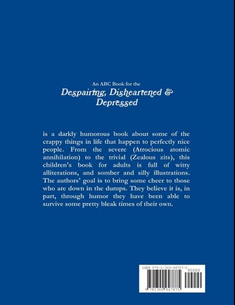 An ABC Book for the Despairing, Disheartened and Depressed is a darkly humorous book about some of the crappy things in life that happen to perfectly nice people. From the severe (Atrocious atomic annihilation) to the trivial (Zealous zits), this children's book for adults is full of witty alliterations, and somber and silly illustrations. The authors' goal is to bring some cheer to those who are down in the dumps. They believe it is, in part, through humor they have been able to survive some pretty bleak times of their own.
