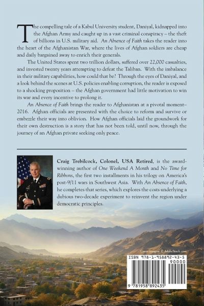 Inspired by real-world events, AN ABSENCE OF FAITH: A Tale of Afghanistan is a novel of the collapse of Afghanistan, seen through the eyes of two protagonists, Daniyal, an Afghan army private, and Colonel Trevanathan, a U.S. Army officer, assigned the Sisyphean task of ending Afghan government corruption. Daniyal is a university student in Kabul, who is forced into the Afghan army by a military press gang. He is starved, beaten, and watches his friends die from incompetent leadership. When he is made the Headquarters clerk for the heartless Command Sergeant Major Mahmood, he learns his army's leaders are getting rich from selling their soldiers' food and medical supplies. Daniyal is torn between the privilege and safety his headquarters' job provides versus his complicity in the widespread corruption. The second parallel story is the arrival in Kabul of U.S. Army Colonel William Trevanathan, who is to be the Counter Corruption Director for the NATO command in Afghanistan. It is November 2015. Trevanathan learns that multiple NATO countries plan to pull out of the war from their frustration with Afghan embezzlement of NATO military aid. The domino effect of departing Western allies will likely lose the war against the Taliban, as the Afghan military is incapable of fighting on its own. Trevanathan's job is to prevent that NATO pullout by ensuring the corrupt Afghan government players are prosecuted, despite no Afghan politician or senior military commander having been charged in the past fifteen years. The challenge is great enough, before Colonel Trevanathan learns his efforts are being undermined by The U.S. Embassy. Both Daniyal and Trevanathan embark on a Kafka-esque adventure across the breadth of Afghanistan to save the Afghan people and themselves, as they fight to cling to their humanity and beliefs in a war where allies are enemies and yes almost always means no. For anyone who has ever wanted clarity why the U.S. was unable to defeat the Taliban despite spending $2 trillion, investing twenty years into building the Afghan National Army, and suffering tens of thousands of U.S. casualties, this is the book you've been waiting for.