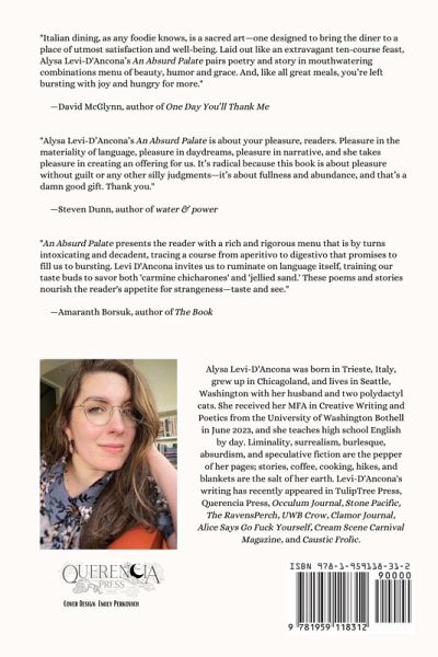 Alysa Levi-D'Ancona was born in Trieste, Italy, grew up in Chicagoland, and lives in Seattle, Washington with her husband and two polydactyl cats. She received her MFA in Creative Writing and Poetics from the University of Washington Bothell in June 2023, and she teaches high school English by day. Liminality, surrealism, burlesque, absurdism, and speculative fiction are the pepper of her pages; stories, coffee, cooking, hikes, and blankets are the salt of her earth. Levi-D'Ancona's writing has recently appeared in TulipTree Press, Querencia Press, Occulum Journal, Stone Pacific, The RavensPerch, UWB Crow, Clamor Journal, Alice Says Go Fuck Yourself, Cream Scene Carnival Magazine, and Caustic Frolic.