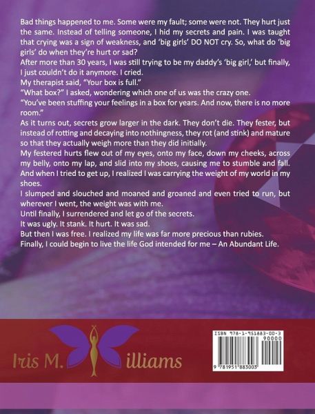 The thing is, secrets don’t die. They fester, but instead of rotting and decaying into nothingness, they rot (and stink) and grow so that they actually weigh more than they did going in. One day I was at work, and my festered hurts flew out of my eyes, onto my face, down my cheeks, across my belly, onto my lap, and slid into my shoes, causing me to stumble and fall. And when I tried to get up, I realized I was carrying the weight of my world in my shoes. I slumped and slouched and moaned and groaned and even tried to run, but wherever I went, the weight was with me. Until finally, I surrendered and let go of the secrets. It was ugly. It stank. It hurt. It was sad. But then I was free. Finally, I could begin to live the life God intended for me – an abundant life.