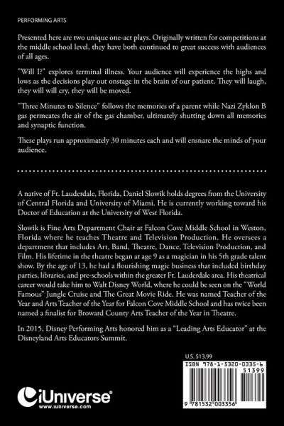 Presented here are two unique one-act plays. Originally written for competitions at the middle school level, they have both continued to great success with audiences of all ages. "Will I?" explores terminal illness. Your audience will experience the highs and lows as the decisions play out onstage in the brain of our patient. They will laugh, they will will cry, they will be moved. "Three Minutes to Silence" follows the memories of a parent while Nazi Zyklon B gas permeates the air of the gas chamber, ultimately shutting down all memories and synaptic function. These plays run approximately 30 minutes each and will ensnare the minds of your audience.