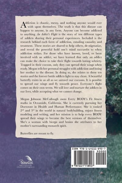 Addiction is chaotic, messy, and nothing anyone would ever wish upon themselves. The truth is that this disease can happen to anyone, in any form. Anyone can become addicted to anything. An Addict's Flight is the story of ten different types of addicts sharing their personal experiences. Included is the research behind each form of addiction, entailing causality and treatment. These stories are shared to help others, de-stigmatize, and reveal the powerful hold one's mind succumbs to when addiction strikes. For those who have known, loved, or been involved with an addict, we have learned that only an addict can make the choice to take their flight towards lasting sobriety. Trapped in their cocoon, only they can spread their wings when ready. Megan tells her personal struggles with addiction and losing her mother to the disease. In doing so, she relates to these ten stories and the forever battle addicts fight to stay clean. A beautiful butterfly exists in us all as we unravel our cocoons. It is possible to spread our wings and fly towards peace. Everyone's flight comes on their own terms. We will love and nurture the addicts in our lives, while accepting what we cannot change. Megan Johnson McCullough owns Every BODY's Fit fitness studio in Oceanside, California. She is currently pursuing her Doctorate in Health and Human Performance. She is ranked 2nd and 3rd in the world in natural bodybuilding, enjoys fitness modeling and writing, and her mission is to help every BODY spread their wings to become the best versions of themselves. She's a woman with biceps and brains she attributes to her mother's surrounding monarch spirit. Butterflies are meant to fly.