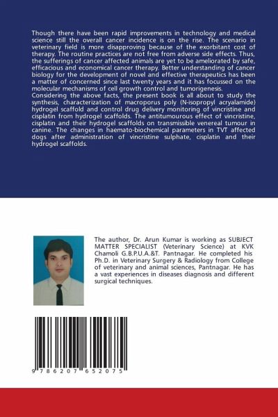 Though there have been rapid improvements in technology and medical science still the overall cancer incidence is on the rise. The scenario in veterinary field is more disapproving because of the exorbitant cost of therapy. The routine practices are not free from adverse side effects. Thus, the sufferings of cancer affected animals are yet to be ameliorated by safe, efficacious and economical cancer therapy. Better understanding of cancer biology for the development of novel and effective therapeutics has been a matter of concerned since last twenty years and it has focussed on the molecular mechanisms of cell growth control and tumorigenesis.Considering the above facts, the present book is all about to study the synthesis, characterization of macroporus poly (N-isopropyl acryalamide) hydrogel scaffold and control drug delivery monitoring of vincristine and cisplatin from hydrogel scaffolds. The antitumourous effect of vincristine, cisplatin and their hydrogel scaffolds on transmissible venereal tumour in canine. The changes in haemato-biochemical parameters in TVT affected dogs after administration of vincristine sulphate, cisplatin and their hydrogel scaffolds.