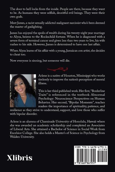 The door to hell locks from the inside. People are there, because they want to be. As humans they were selfish, deceitful evil beings. They were their own gods. Meet James, a racist sexually addicted malignant narcissist who's been deemed the master of gaslighting. James has enjoyed the spoils of wealth during his twenty-eight year marriage to Alyza, heiress to the Rockschild fortune. When he is diagnosed with a severe form of terminal cancer and given less than two years to live, his wife rushes to his side. However, James is determined to have one last affair. When Alyza learns of his affair with a young, Jamaican con artist, she decides to cheat too. Now everyone is sinning, but someone will die.