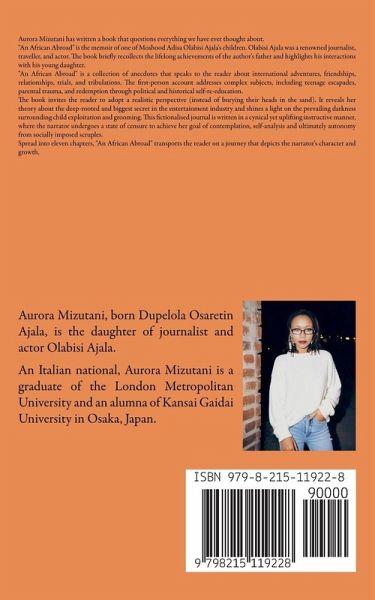 Aurora Mizutani has written a book that questions everything we have ever thought about. "An African Abroad" is the memoir of one of Moshood Adisa Olabisi Ajala's children. Olabisi Ajala was a renowned journalist, traveller, and actor. The book briefly recollects the lifelong achievements of the author's father and highlights his interactions with his young daughter. "An African Abroad" is a collection of anecdotes that speaks to the reader about international adventures, friendships, relationships, trials, and tribulations. The first-person account addresses complex subjects, including teenage escapades, parental trauma, and redemption through political and historical self-re-education. The book invites the reader to adopt a realistic perspective (instead of burying their heads in the sand). It reveals her theory about the deep-rooted and biggest secret in the entertainment industry and shines a light on the prevailing darkness surrounding child exploitation and grooming. This fictionalised journal is written in a cynical yet uplifting instructive manner, where the narrator undergoes a state of censure to achieve her goal of contemplation, self-analysis and ultimately autonomy from socially imposed scruples. Spread into eleven chapters, "An African Abroad" transports the reader on a journey that depicts the narrator's character and growth.