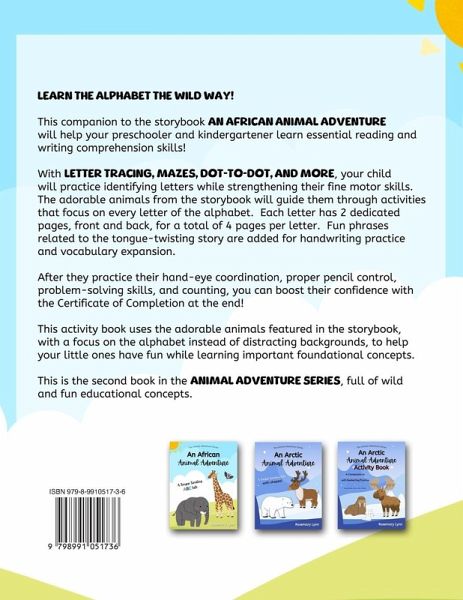 Learn the alphabet the wild way! This companion to the storybook AN AFRICAN ANIMAL ADVENTURE will help your preschooler and kindergartner learn essential reading and writing comprehension skills! With letter tracing, mazes, dot-to-dot, and more, your child will practice identifying letters while strengthening their fine motor skills. The adorable animals from the storybook will guide them through activities that focus on every letter of the alphabet. Each letter has 2 dedicated pages, front and back, for a total of 4 pages per letter. Fun phrases related to the tongue-twisting story are added for handwriting practice and vocabulary expansion. After they practice their hand-eye coordination, proper pencil control, problem-solving skills, and counting, you can boost their confidence with the Certificate of Completion at the end! This activity book uses the adorable animals featured in the storybook, with a focus on the alphabet instead of distracting backgrounds, to help your little ones have fun while learning important foundational concepts.