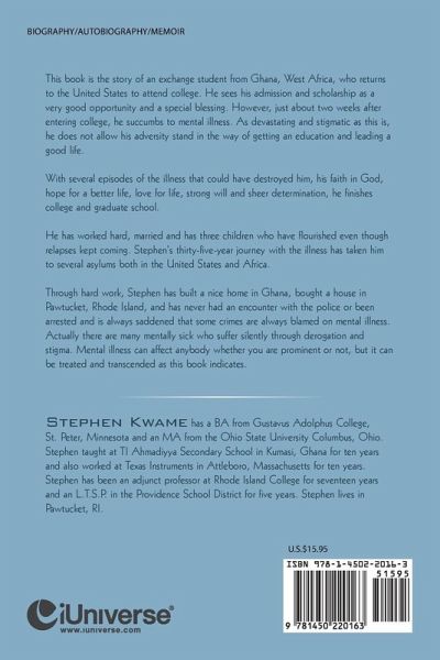 This book is the story of an exchange student from Ghana, West Africa, who returns to the United States to attend college. He sees his admission and scholarship as a very good opportunity and a special blessing. However, just about two weeks after entering college, he succumbs to mental illness. As devastating and stigmatic as this is, he does not allow his adversity stand in the way of getting an education and leading a good life. With several episodes of the illness that could have destroyed him, his faith in God, hope for a better life, love for life, strong will and sheer determination, he finishes college and graduate school. He has worked hard, married and has three children who have flourished even though relapses kept coming. Stephen's thirty-five-year journey with the illness has taken him to several asylums both in the United States and Africa. Through hard work, Stephen has built a nice home in Ghana, bought a house in Pawtucket, Rhode Island, and has never had an encounter with the police or been arrested and is always saddened that some crimes are always blamed on mental illness. Actually there are many mentally sick who suffer silently through derogation and stigma. Mental illness can affect anybody whether you are prominent or not, but it can be treated and transcended as this book indicates.