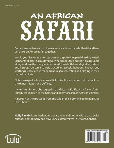 Come travel with me across the sea, where animals roam both wild and free! Let's take an African safari together. Would you like to see a lion up close or a spotted leopard drinking water? Elephants at play in a muddy pool, while rhinos feed on short grass? Come along and see the many animals of Africa-buffalo and giraffes, zebras and hippos. You can also visit crocodiles, jackals, baboons, hyenas, and warthogs! There are so many creatures to see, eating and playing in their natural habitats. Note the oxpecker birds who eat ticks, flies, lice and worms off the backs of the rhinos, hippos, and buffalos. Including vibrant photographs of African wildlife, An African Safari introduces children to the names and behaviors of many African animals. A portion of the proceeds from the sale of this book will go to help Kids Help Phone. WINNER: CANADA BOOK AWARDS.