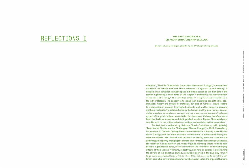 An Age of Our Own Making ist der ergänzende Reader zu der gleichnamigen von Bonaventure Soh Bejeng Ndikung und Solvej Helweg Ovesen kuratierten Ausstellung in Dänemark. Die Ausstellung setzt sich aus drei Teilen zusammen, Reflections I-III, die die Besucher einladen, darüber nachzudenken, wie wir auf dieser Welt zusammenleben können - jenseits der aktuellen Entwicklungen von Abschottung und unhaltbaren Privilegien. Der Reader beinhaltet Texte von Dipesh Chakrabarty, Vyjayanthi Rao, Henrik Vigh, AbdouMaliq Simone, Roberto Esposito and Jane Bennett. Er stellt sich der Herausforderung, einige der charakteristischen Aspekte herauszuarbeiten, die die Ära des Anthropozentrismus auszeichnen, und unterteilt diese in drei wesentliche Ansätze: die Neudefinition von Material im ökologischen und post-kolonialen Kontext; das Konzept der überproportionalen Schutzmaßnahmen (in Bezug auf Migration), das sich im Nationalstaat manifestiert; und das unternehmerische Handeln der Staatsbürgerschaft.Folgende Künstler nehmen an der Ausstellung teil: Reflection I: Ibrahim Mahama, Eko Prawoto, Sammy Baloji, Ehsan Ul Haq, Angela Melitopoulos & Angela Anderson, Georges Adéagbo, Jems Robert Koko Bi, Julie Djikey, Jean Katambayi Mukendi, Misheck Masamvu, Hamed Ouattara. Reflection II: Athi-Patra Ruga, Bernard Akoi-Jackson, Ato Malinda, Aman Mojadidi, Mwangi Hutter, Amy Lee Sanford, Moe Satt, Urnamo, Nathalie Bikoro, Harold Offeh. Reflection III: Moshekwa Langa, Ibrahim Mahama, Kamal Aljafari, Tita Salina & Irwan Ahmett.