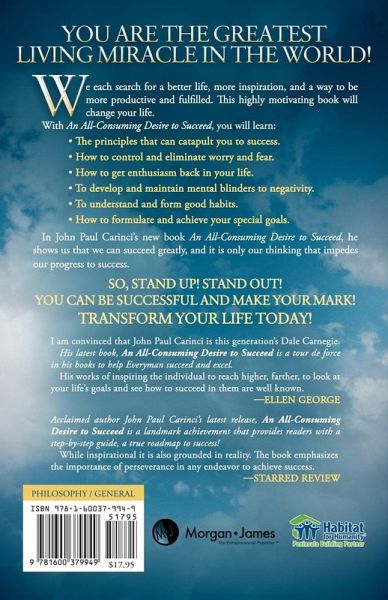 We each search for a better life, more inspiration, and a way to be more productive and fulfilled. We are in constant competition in personal life and business. You can stand out from the crowd. With: "An All-Consuming Desire to Succeed", you will learn: How to maintain a competitive edge through Positive Affirmations. How to control negative influences. The secrets that the highly successful possess. How to plan out and achieve newfound goals. Learning to motivate yourself to become and stay different than all others.
