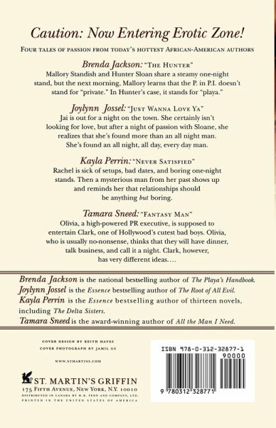 Brenda Jackson: "The Hunter" Mallory Standish and Hunter Sloan share a steamy one night stand. But, the next morning, Mallory learns that the P. in P.I. doesn't stand for "private." In Hunter's case, it stands for "playa." Joylynn Jossel: "Just Wanna Love Ya" Jai is out for a night on the town. She certainly isn't looking for love. But, after a night of passion with Sloane, she realizes that she's found more than an all night man. She's found an all night, all day, every day man. Kayla Perrin: "Never Satisfied" Rachel is sick of set-ups, bad dates, and boring one night stands. Then, a mysterious man from her past shows up and reminds Rachel that relationships should be anything but boring. Tamara Sneed: "Fantasy Man" Olivia, a high powered PR executive, is supposed to entertain Clark, one of Hollywood's cutest bad boys. Olivia, who is usually no-nonsense, thinks that they will have dinner, talk business, and call it a night. Clark, however, has very different ideas. . .