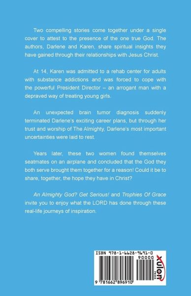Two compelling stories come together under a single cover to attest to the presence of the one true God. The authors, Darlene and Karen, share spiritual insights they have gained through their relationships with Jesus Christ. At 14, Karen was admitted to a rehab center for adults with substance addictions and was forced to cope with the powerful President Director - an arrogant man with a depraved way of treating young girls. An unexpected brain tumor diagnosis suddenly terminated Darlene's exciting career plans, but through her trust and worship of The Almighty, Darlene's most important uncertainties were laid to rest. Years later, these two women found themselves seatmates on an airplane and concluded that the God they both serve brought them together for a reason! Could it be to share, together, the hope they have in Christ? An Almighty God? Get Serious! and Trophies Of Grace invite you to enjoy what the LORD has done through these real-life journeys of inspiration.