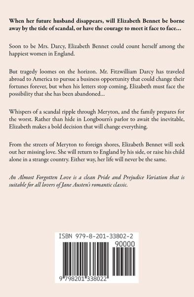 When her future husband disappears, will Elizabeth Bennet be borne away by the tide of scandal, or have the courage to meet it face to face… Soon to be Mrs. Darcy, Elizabeth Bennet could count herself among the happiest women in England. But tragedy loomes on the horizon. Mr. Fitzwilliam Darcy has traveled abroad to America to pursue a business opportunity that could change their fortunes forever, but when his letters stop coming, Elizabeth must face the possibility that she has been abandoned… Whispers of a scandal ripple through Meryton, and the family prepares for the worst. Rather than hide in Longbourn's parlor to await the inevitable, Elizabeth makes a bold decision that will change everything. From the streets of Meryton to foreign shores, Elizabeth Bennet will seek out her missing love. She will return to England by his side, or raise his child alone in a strange country. Either way, her life will never be the same. An Almost Forgotten Love is a clean Pride and Prejudice Variation that is suitable for all lovers of Jane Austen's romantic classic.