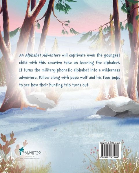 An Alphabet Adventure will captivate even the youngest child with this creative take on learning the alphabet. It turns the military phonetic alphabet into a wilderness adventure. Follow along with papa wolf and his four pups to see how their hunting trip turns out.
