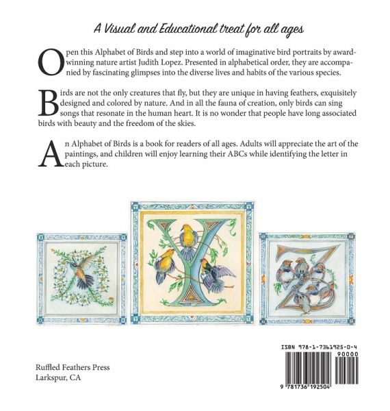 Open this Alphabet of Birds and step into a world of imaginative bird portraits by award-winning nature artist Judith Lopez. Presented in the style of an illuminated manuscript, and in alphabetical order, each letter is accompanied by a fascinating glimpse into the diverse lives and habits of the various species. Birds are not the only creatures that fly, but they are unique in having feathers, exquisitely designed and colored by nature. And in all the fauna of creation, only birds can sing songs that resonate in the human heart. It is no wonder that people have long associated birds with beauty and the freedom of the skies. This collection of 26 birds includes delightful portraits of the Barn Owl, Egret, Hummingbird, and Peacock. As a fine arts printmaker, Judith has shown her etchings in west coast galleries as well as juried museum exhibits. Her artwork is represented in the permanent collection of the Achenbach Foundation for Graphic Arts at the California Palace of the Legion of Honor. A previously published award-winning illustrator of Dancers in the Garden, this is her first book as writer and illustrator. ¿¿An Alphabet of Birds is a book for readers of all ages. Adults will appreciate the art of the paintings, and children will enjoy learning their ABCs while identifying the letter in each picture.