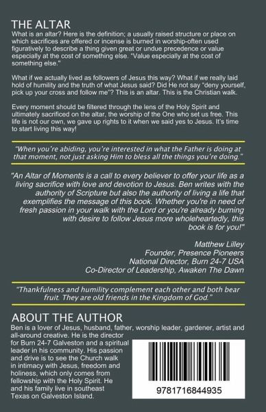 "An Altar of Moments is a call to every believer to offer your life as a living sacrifice with love and devotion to Jesus. Ben writes with the authority of Scripture but also the authority of living a life that exemplifies the message of this book. Whether you're in need of fresh passion in your walk with the Lord or you're already burning with desire to follow Jesus more wholeheartedly, this book is for you!"