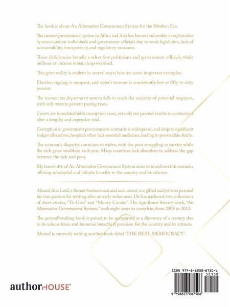 The book is about An Alternative Government System for the Modern Era. The current governmental system in Africa and Asia has become vulnerable to exploitation by unscrupulous individuals and government officials due to weak legislation, lack of accountability, transparency, and regulatory measures. These deficiencies benefit a select few politicians and government officials, while millions of citizens remain impoverished. This grim reality is evident in several ways; here are some important examples: Election rigging is rampant, and voter's turnout is consistently low at fifty to sixty percent. The income tax department system fails to reach the majority of potential taxpayers, with only twenty percent paying taxes. Courts are inundated with corruption cases, yet only ten percent results in convictions after a lengthy and expensive trial. Corruption in government procurements contracts is widespread, and despite significant budget allocations, hospitals often lack essential medicines, leading to preventable deaths. The economic disparity continues to widen, with the poor struggling to survive while the rich grow wealthier each year. Many countries lack directives to address the gap between the rich and poor. My innovative of An Alternative Government System aims to transform this scenario, offering substantial and infinite benefits to the country and its citizens.