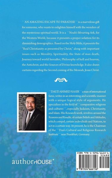 ´´AN AMAZING ESCAPE TO PARADISE´´ is a marvelous gift for someone, who wants to enlighten himself with the wonders of the mysterious spiritual world. It is a ´´Noah’s lifesaving Ark, for the Western World, because it presents a proper solution for its diminishing demographics. Based on the Holy Bible, it presents the "Real Christianity as presented by Christ," along with important issues such as Morality, Spirituality, the State of man death, Journey toward world hereafter, Philosophy of hell and heaven, the Antichrist, and the Sources of Divine knowledge. It also draws curtains regarding the Second coming of the Messiah, Jesus Christ.