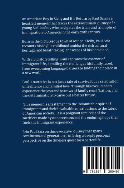 An American Boy in Sicily and His Return by Paul Saia is a heartfelt memoir that traces the extraordinary journey of a young Sicilian boy who navigates the trials and triumphs of immigration to America in the early 20th century. Born in the picturesque town of Mineo, Sicily, Paul Saia recounts his idyllic childhood amidst the rich cultural heritage and breathtaking landscapes of his homeland. Paul embarks on a life-changing voyage, braving the uncertainties of ocean travel. Paul's narrative is not just a tale of survival but a celebration of resilience and familial love. Through his eyes, readers experience the warmth of community in Boston's North End, the joys and sorrows of family reunification, and the determination to carve out a better future. This memoir is a testament to the indomitable spirit of immigrants and their invaluable contributions to the fabric of American society. It is a poignant reminder of the sacrifices made by our ancestors and the enduring hope that fuels the immigrant experience. Join Paul Saia on this evocative journey that spans continents and generations, offering a deeply personal perspective on the timeless quest for a better life.