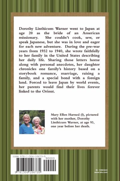 Dorothy Linthicum Warner went to Japan at age 20 as the bride of an American missionary. She couldn't cook, sew, or speak Japanese, but she was in love and eager for each new adventure. During the pre-war years from 1932 to 1940, she wrote faithfully to her family in the United States describing her daily life. Sharing those letters home along with personal anecdotes, her daughter chronicles one family's history based on a storybook romance, marriage, raising a family, and a special bond with a foreign land. Forced to leave Japan by world events, her parents would find their lives forever linked to the Orient.