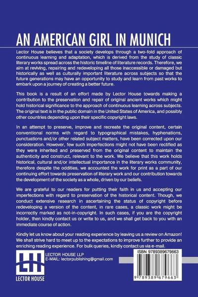 An American Girl In Munich: Impressions Of A Music Student This book is a result of an effort made by us towards making a contribution to the preservation and repair of original classic literature. In an attempt to preserve, improve and recreate the original content, we have worked towards: 1. Type-setting & Reformatting: The complete work has been re-designed via professional layout, formatting and type-setting tools to re-create the same edition with rich typography, graphics, high quality images, and table elements, giving our readers the feel of holding a 'fresh and newly' reprinted and/or revised edition, as opposed to other scanned & printed (Optical Character Recognition - OCR) reproductions. 2. Correction of imperfections: As the work was re-created from the scratch, therefore, it was vetted to rectify certain conventional norms with regard to typographical mistakes, hyphenations, punctuations, blurred images, missing content/pages, and/or other related subject matters, upon our consideration. Every attempt was made to rectify the imperfections related to omitted constructs in the original edition via other references. However, a few of such imperfections which could not be rectified due to intentional\unintentional omission of content in the original edition, were inherited and preserved from the original work to maintain the authenticity and construct, relevant to the work. We believe that this work holds historical, cultural and/or intellectual importance in the literary works community, therefore despite the oddities, we accounted the work for print as a part of our continuing effort towards preservation of literary work and our contribution towards the development of the society as a whole, driven by our beliefs. We are grateful to our readers for putting their faith in us and accepting our imperfections with regard to preservation of the historical content. HAPPY READING!