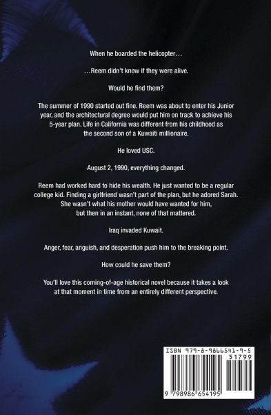 When he boarded the helicopter... ...Reem didn't know if they were alive. Would he find them? The summer of 1990 started out fine. Reem was about to enter his Junior year, and the architectural degree would put him on track to achieve his 5-year plan. Life in California was different from his childhood as the second son of a Kuwaiti millionaire. He loved USC. August 2, 1990, everything changed. Reem had worked hard to hide his wealth. He just wanted to be a regular college kid. Finding a girlfriend wasn't part of the plan, but he adored Sarah. She wasn't what his mother would have wanted for him, but then in an instant, none of that mattered. Iraq invaded Kuwait. Anger, fear, anguish, and desperation push him to the breaking point. How could he save them? You'll love this coming-of-age historical novel because it takes a look at that moment in time from an entirely different perspective.