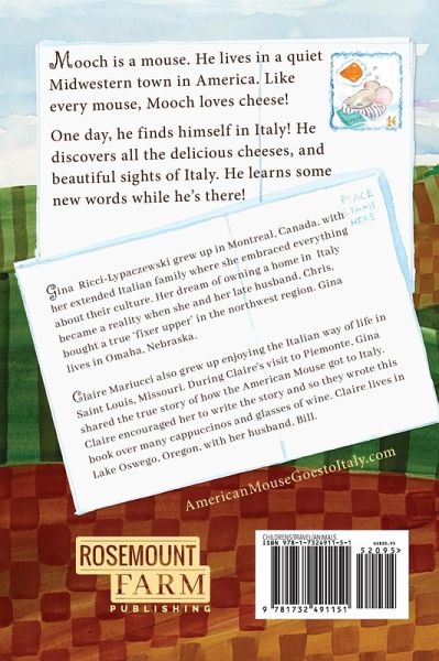 Mooch is a mouse. He lives in a quiet Midwestern town in America. Like every mouse, Mooch loves cheese! One day, he finds himself in Italy! He discovers all the delicious cheeses, and beautiful sights of Italy. He learns some new words while he's there! Beautiful illustrations show many scenes from Italy. Vocabulary words are introduced in Italian, and Italian cheeses are celebrated.