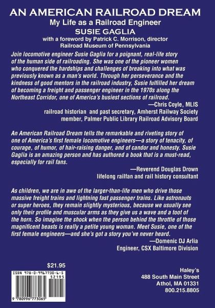 Susie Gaglia reminisces about fulfilling her childhood dream with her career as railroad engineer for passenger and freight trains along the Northeast Corridor during the mid twentieth century. Beginning with her upbringing in a suburb of Buffalo through the process of qualifying to operate locomotives to vignettes from her fifteen-year career, Susie remembers kind mentors, close encounters on the tracks, near misses, massive accidents, and moments of sexual harassment as she fulfilled an American railroad dream.