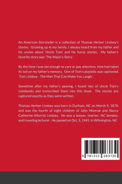 An American Storyteller is a collection of Thomas Herber Lindsey's stories. Growing up in my family, I always heard from my father and his uncles about 'Uncle Tom' and his funny stories. My father's favorite story was 'The Major's Story.' By the time I was old enough to care or pay attention, time had taken its toll on my father's memory. One of Tom's playbills was captioned, 'Tom Lindsey - The Man That Can Make You Laugh.' Sometime after my father's passing, I found two of Uncle Tom's notebooks and transcribed them into this book. The stories are captured exactly as they were written. Thomas Herber Lindsey was born in Durham, NC on March 9, 1878, and was the fourth of eight children of John Monroe and Nancy Catherine (Morris) Lindsey. He was a lawyer, teacher, NC Senator, and traveling lecturer. He passed on Oct. 3, 1941, in Wilmington, NC.
