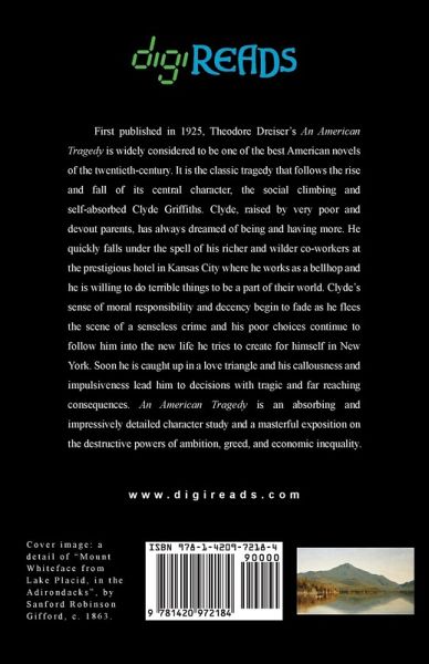 First published in 1925, Theodore Dreiser's "An American Tragedy" is widely considered to be one of the best American novels of the twentieth-century. It is the classic tragedy that follows the rise and fall of its central character, the social climbing and self-absorbed Clyde Griffiths. Clyde, raised by very poor and devout parents, has always dreamed of being and having more. He quickly falls under the spell of his richer and wilder co-workers at the prestigious hotel in Kansas City where he works as a bellhop and he is willing to do terrible things to be a part of their world. Clyde's sense of moral responsibility and decency begin to fade as he flees the scene of a senseless crime and his poor choices continue to follow him into the new life he tries to create for himself in New York. Soon he is caught up in a love triangle and his callousness and impulsiveness lead him to decisions with tragic and far reaching consequences. "An American Tragedy" is an absorbing and impressively detailed character study and a masterful exposition on the destructive powers of ambition, greed, and economic inequality. This edition is printed on premium acid-free paper.