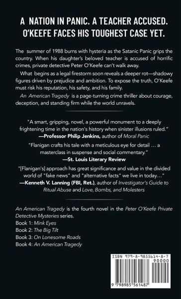 A nation in panic. A teacher accused. O'Keefe faces his toughest case yet. The summer of 1988 is ablaze-not just with heat but with hysteria. As Satanic Panic sweeps the nation, innocent lives hang in the balance. Private detective Peter O'Keefe never expected to be drawn into the storm, but when his daughter's beloved teacher "Miss Ginny" is accused of unspeakable crimes, he can't turn away. The case reeks of mass hysteria and hidden agendas, but standing against the tide could cost O'Keefe everything. As he fights to unravel the truth, he's forced to go toe-to-toe with shadowy child protection figures more interested in securing convictions than justice. With lives shattered and the weight of a nation's paranoia pressing down, O'Keefe must risk it all to expose the truth before it's too late. In a world consumed by fear, will justice prevail-or will the innocent be lost forever? A gripping crime thriller steeped in real-world hysteria, An American Tragedy is a heart-stopping tale of courage, deception, and the high price of seeking the truth.