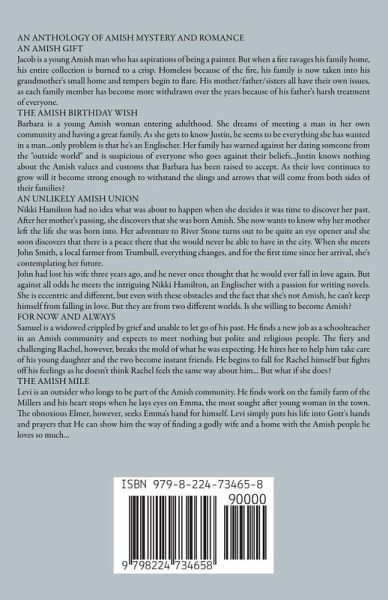 AN ANTHOLOGY OF AMISH MYSTERY AND ROMANCE AN AMISH GIFT Jacob is a young Amish man who has aspirations of being a painter. But when a fire ravages his family home, his entire collection is burned to a crisp. Homeless because of the fire, his family is now taken into his grandmother's small home and tempers begin to flare. His mother/father/sisters all have their own issues, as each family member has become more withdrawn over the years because of his father's harsh treatment of everyone. THE AMISH BIRTHDAY WISH Barbara is a young Amish woman entering adulthood. She dreams of meeting a man in her own community and having a great family. As she gets to know Justin, he seems to be everything she has wanted in a man...only problem is that he's an Englischer. Her family has warned against her dating someone from the "outside world" and is suspicious of everyone who goes against their beliefs...Justin knows nothing about the Amish values and customs that Barbara has been raised to accept. As their love continues to grow will it become strong enough to withstand the slings and arrows that will come from both sides of their families? AN UNLIKELY AMISH UNION Nikki Hamilton had no idea what was about to happen when she decides it was time to discover her past. After her mother's passing, she discovers that she was born Amish. She now wants to know why her mother left the life she was born into. Her adventure to River Stone turns out to be quite an eye opener and she soon discovers that there is a peace there that she would never be able to have in the city. When she meets John Smith, a local farmer from Trumbull, everything changes, and for the first time since her arrival, she's contemplating her future. John had lost his wife three years ago, and he never once thought that he would ever fall in love again. But against all odds he meets the intriguing Nikki Hamilton, an Englischer with a passion for writing novels. She is eccentric and different, but even with these obstacles and the fact that she's not Amish, he can't keep himself from falling in love. But they are from two different worlds. Is she willing to become Amish? FOR NOW AND ALWAYS Samuel is a widowed crippled by grief and unable to let go of his past. He finds a new job as a schoolteacher in an Amish community and expects to meet nothing but polite and religious people. The fiery and challenging Rachel, however, breaks the mold of what he was expecting. He hires her to help him take care of his young daughter and the two become instant friends. He begins to fall for Rachel himself but fights off his feelings as he doesn't think Rachel feels the same way about him... But what if she does? THE AMISH MILE Levi is an outsider who longs to be part of the Amish community. He finds work on the family farm of the Millers and his heart stops when he lays eyes on Emma, the most sought after young woman in the town. The obnoxious Elmer, however, seeks Emma's hand for himself. Levi simply puts his life into Gott's hands and prayers that He can show him the way of finding a godly wife and a home with the Amish people he loves so much...