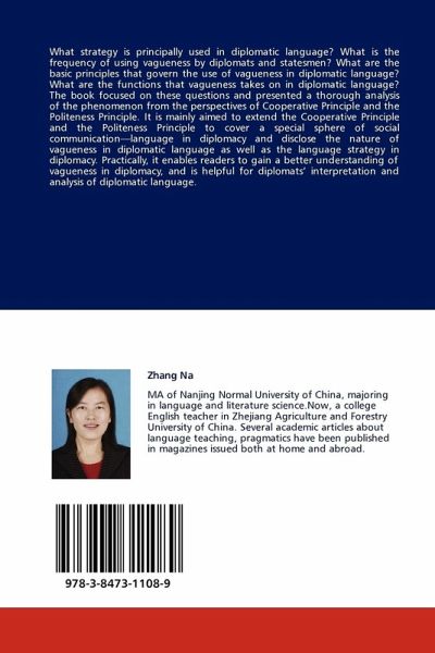 What strategy is principally used in diplomatic language? What is the frequency of using vagueness by diplomats and statesmen? What are the basic principles that govern the use of vagueness in diplomatic language? What are the functions that vagueness takes on in diplomatic language? The book focused on these questions and presented a thorough analysis of the phenomenon from the perspectives of Cooperative Principle and the Politeness Principle. It is mainly aimed to extend the Cooperative Principle and the Politeness Principle to cover a special sphere of social communication language in diplomacy and disclose the nature of vagueness in diplomatic language as well as the language strategy in diplomacy. Practically, it enables readers to gain a better understanding of vagueness in diplomacy, and is helpful for diplomats interpretation and analysis of diplomatic language.
