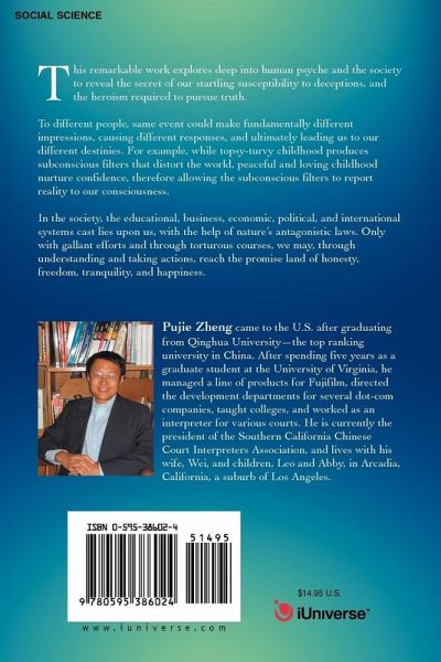 This remarkable work explores deep into human psyche and the society to reveal the secret of our startling susceptibility to deceptions, and the heroism required to pursue truth. To different people, same event could make fundamentally different impressions, causing different responses, and ultimately leading us to our different destinies. For example, while topsy-turvy childhood produces subconscious filters that distort the world, peaceful and loving childhood nurture confidence, therefore allowing the subconscious filters to report reality to our consciousness. In the society, the educational, business, economic, political, and international systems cast lies upon us, with the help of nature's antagonistic laws. Only with gallant efforts and through torturous courses, we may, through understanding and taking actions, reach the promise land of honesty, freedom, tranquility, and happiness.