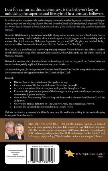 This is the blueprint for living out the first-century supernatural life!Sid Roth, host of It's Supernatural! Lost for centuries, this ancient text is the believer's key to unlocking the supernatural lifestyle of first-century believers. In the book of Acts, we glimpse the world-changing community marked by passion, authenticity, and supernatural power that was the early Church. How did the early church cultivate these kinds of powerful believers? Where does the modern church fall short? And what if you could access the early Church's discipleship manual? Picture it: While browsing the stacks of a dimly lit library in the cavernous corridors of an Middle Eastern monastery, a young Greek Orthodox cleric stumbles upon a fragile parchment manuscript, containing ancient wisdom. The cleric's name was Philotheos Bryennios, the year was 1873, the place was Istanbul, Turkey, and the incredible document he found was called the Didache, or "the Teaching." The Didache is a transformative step-by-step training program for new believers, and offers a window into the faith and practice of the earliest Gentile disciples, when Christianity was still within the fold of Messianic Judaism. Written for a culture where individuals had no knowledge of Jesus or the gospel, the Didache's timeless instruction is especially applicable for our current, postchristian era. Ancient Blueprints for the Supernatural contains the full text of the Didache along with extensive, revelatory commentary and application from Drs. Dennis and Jen Clark. You will: Discover how to live as a holy vessel in a godless society. Enter a new way of life that reveals Jesus of Nazareth to the world. Access the miraculous lifestyle that Jesus made possible through the Cross. Experience the presence and power of God through ancient practices such as persistent prayer, communion, baptism, and more. Gain wisdom for discerning false teaching and doctrine that obscures the fullness of God's life and power. Uncover the Biblical definition of "The One New Man," and what it means for you. Learn to live in watchful preparation for the Messiah's return. Unleash the timeless wisdom of the Didache into your life, and begin walking in the world-changing footsteps of the early church.