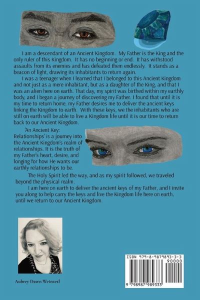 I am a descendant of an Ancient Kingdom. My Father is the King and the only ruler of this Kingdom. It has no beginning or end. It has withstood assaults from its enemies and has defeated them endlessly. It stands as a beacon of light, drawing its inhabitants to return again. I was a teenager when I learned that I belonged to this Ancient Kingdom and not just as a mere inhabitant, but as a daughter of the King, and that I was an alien here on earth. That day, my spirit was birthed within my earthly body, and I began a journey of discovering my Father. I found that until it is my time to return home, my Father desires me to deliver the ancient keys linking the Kingdom to earth. With these keys, we the inhabitants who are still on earth will be able to live a Kingdom life until it is our time to return back to our Ancient Kingdom. 'An Ancient Key: Relationships' is a journey into the Ancient Kingdom's realm of relationships. It is the truth of my Father's heart, desire, and longing for how He wants our earthly relationships to be. The Holy Spirit led the way, and as my spirit followed, we traveled beyond the physical realm. I am here on earth to deliver the ancient keys of my Father, and I invite you along to help carry the keys and live the Kingdom life here on earth, until we return to our Ancient Kingdom.