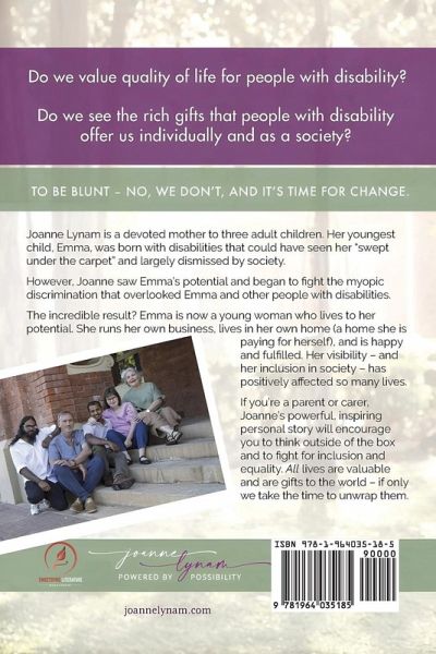 Do we value quality of life for people with disability? Do we see the rich gifts that people with disability offer us individually and as a society? To be blunt - no, we don't, and it's time for change. Joanne Lynam is a devoted mother to three adult children. Her youngest child, Emma, was born with disabilities that could have seen her "swept under the carpet" and largely dismissed by society. However, Joanne saw Emma's potential and began to fight the myopic discrimination that overlooked Emma and other people with disabilities. The incredible result? Emma is now a young woman who lives to her potential. She runs her own business, lives in her own home (a home she is paying for herself), and is happy and fulfilled. Her visibility - and her inclusion in society - has positively affected so many lives. If you're a parent or carer, Joanne's powerful, inspiring personal story will encourage you to think outside of the box and to fight for inclusion and equality. All lives are valuable and are gifts to the world - if only we take the time to unwrap them.