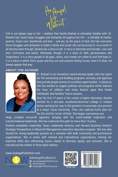 An Angel for Detroit is Sandra Braham's groundbreaking memoir, detailing her family's history dating back to 1805. This large, poor farming family made its way from Coatopa, Alabama to Kinloch, Missouri where heartbreak, love, and the mysteries of faith shaped their lives. The story takes unexpected turns when the youngest daughter, Doris, gave birth, and raised three daughters, keeping them close while living with schizophrenia. Ms. Braham's memoir follows her childhood, through foster care, and then to her ultimate success, both personal and professional. Having benefited from her family's generational faith and an angel encounter that awakened her. This true-to-life story will be a book that you will not be able to put down until the last page is read. About The AuthorSandra E. Braham, EdD Dr. Braham is an innovative, award-winner leader who has spent her life envisioning and building programs, services, and agencies that provide people access to countless opportunities. In doing so, she has worked to support policies and programs which improve the lives of children and close historic gaps that hinder individuals' and families' future success. Over the first 17 years of her career in higher education, Sandra worked for a two-year vocational-technical college in Indiana before working her way to the position of associate vice provost at a major Texas University. Then, she realized that God's plan for her life and career had shifted. She began overseeing very large, complex nonprofit agencies, bringing with her much-needed inspiration and transformational leadership. She has continued this path for more than 15 years. Braham completed Leadership Texas, Leadership America, and Harvard Business School's Strategic Perspectives in Nonprofit Management executive education program. She has also shared her strong leadership acumen as a volunteer with both community and professional organizations. She is active with national and international organizations, sharing her expertise while also addressing issues related to diversity, equity, and inclusion. She is married and the mother of three adult children.