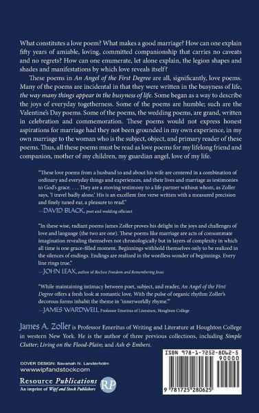 What constitutes a love poem? What makes a good marriage? How can one explain fifty years of amiable, loving, committed companionship that carries no caveats and no regrets? How can one enumerate, let alone explain, the legion shapes and shades and manifestations by which love reveals itself? These poems in An Angel of the First Degree are all, significantly, love poems. Many of the poems are incidental in that they were written in the busyness of life, the way many things appear in the busyness of life. Some began as a way to describe the joys of everyday togetherness. Some of the poems are humble; such are the Valentine's Day poems. Some of the poems, the wedding poems, are grand, written in celebration and commemoration. These poems would not express honest aspirations for marriage had they not been grounded in my own experience, in my own marriage to the woman who is the subject, object, and primary reader of these poems. Thus, all these poems must be read as love poems for my lifelong friend and companion, mother of my children, my guardian angel, love of my life.