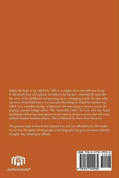 Ralph (he hates to be called Mr. Hill) is an eighty-four-year-old man living in the South East of England. He believes he has led a charmed life and tells the story of his childhood and growing up in a changing world. He then adds the story of the final hours of a Lancaster Bombing in which his brother was killed. In a complete change of direction, the next piece is about a system for playing contract bridge called "The Amenable Club." For one who has hated the disputes following some games, he has tried to devise a system that will cause the least friction between players. His greatest hope is that he has amused you and not offended you, the reader, in any way. He speaks of real people in his biography but gives no names where he thought they would give offense.