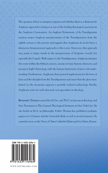 The question of how to interpret scripture and whether there is a distinctively Anglican approach to doing so is one of the leading theological questions in the Anglican Communion. An Anglican Hermeneutic of the Transfiguration analyzes major Anglican interpretations of the Transfiguration from the eighth century to the present and suggests that Anglicans do in fact have a distinctive hermeneutical approach to this event. Moreover, this approach may point to larger trends in the interpretation of Scripture overall, but especially the Gospels. With respect to the Transfiguration, Anglicans interpret the event within the biblical context, assume its basic historic character, and juxtapose high Christology with the human limitations of Jesus' self-understanding. Furthermore, Anglicans draw pastoral implications for the lives of Jesus and the disciples from the Transfiguration and assert that the glory manifested on the mountain supports a partially realized eschatology. Finally, Anglicans write for well-educated, non-specialists in theology.