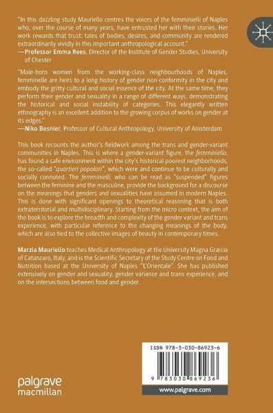 This book recounts the author's fieldwork among the trans and gender-variant communities in Naples. This is where a gender-variant figure, the femminiello, has found a safe environment within the city's historical poorest neighborhoods, the so-called "quartieri popolari", which were and continue to be culturally and socially connoted. The femminielli, who can be read as "suspended" figures between the feminine and the masculine, provide the background for a discourse on the meanings that genders and sexualities have assumed in modern Naples. This is done with significant openings to theoretical reasoning that is both extraterritorial and multidisciplinary. Starting from the micro context, the aim of the book is to explore the breadth and complexity of the gender variant and trans experience, with particular reference to the changing meanings of the body, which are also tied to the collective images of beauty in contemporary times.