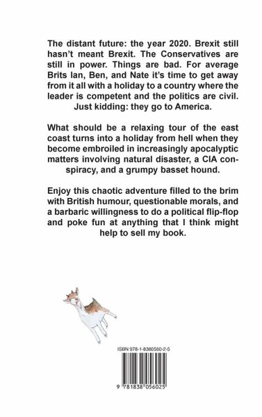 The distant future: the year 2020. Brexit still hasn't meant brexit. The conservatives are still in power. Things are bad. For average Brits Ian, Ben, and Nate it's time to get away from it all with a holiday to a country where the leader is competent and the politics are civil. Just kidding: they go to America. What should be a relaxing tour of the east coast turns into a holiday from hell when they become embroiled in increasingly apocalyptic matters involving natural disaster, a CIA conspiracy, and a grumpy basset hound. Enjoy this chaotic adventure filled to the brim with British humour, questionable morals, and a barbaric willingness to do a political flip-flop and poke fun at anything that I think might help to sell my book.