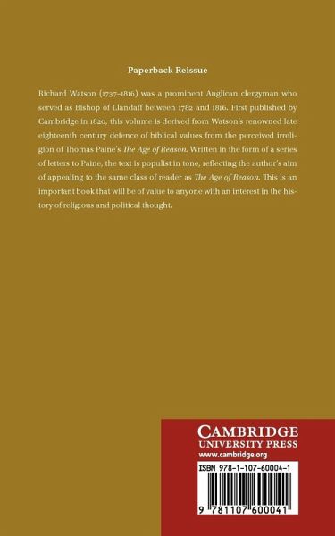 Richard Watson (1737-1816) was a prominent Anglican clergyman who served as Bishop of Llandaff between 1782 and 1816. First published by Cambridge in 1820, this volume is derived from Watson's renowned late eighteenth century defence of biblical values from the perceived irreligion of Thomas Paine's The Age of Reason. Written in the form of a series of letters to Paine, the text is populist in tone, reflecting the author's aim of appealing to the same class of reader as The Age of Reason. This is an important book that will be of value to anyone with an interest in the history of religious and political thought.