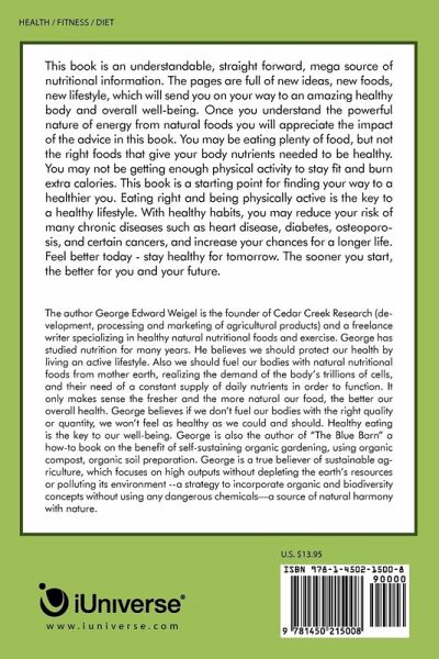 This understandable book, is straight forward, mega source of nutritional information. The pages are full of new ideas, news foods, new lifestyle. Which will send you on your way to an amazing healthy body, great health and overall well-being. Once you understand the powerful nature of energy, from natural foods you will appreciate the impact of this advice within the pages of this book. You may be eating plenty of food, but not eating the right foods that give your body the nutrients you need to be healthy. You may not be getting enough physical activity to stay fit and burn those extra calories. This book is a starting point for finding your way to a healthier you. Eating right and being physically active is the key to a healthy lifestyle. With healthy habits, you may reduce your risk of many chronic diseases such as heart disease, diabetes, osteoporosis, and certain cancers, and increase your chances for a longer life. Feel better today - Stay healthy for tomorrow. The sooner you start, the better for you, and your future.